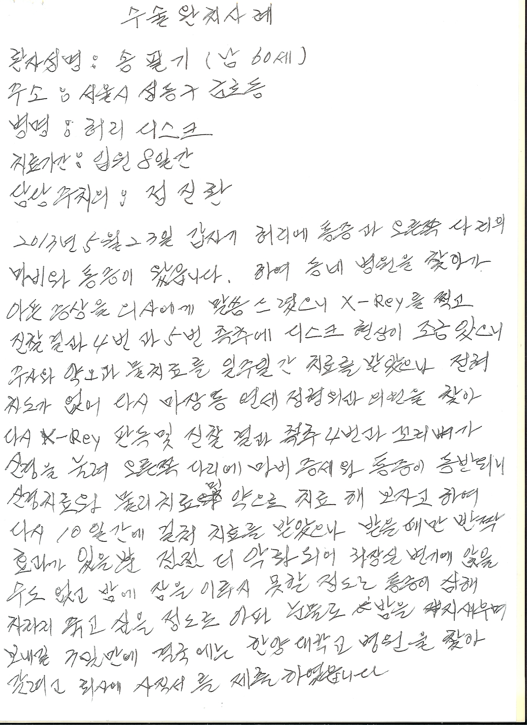 2013년 5월 23일 갑자기 허리에 통증과 오른쪽 다리의 마비와 통증이 왔습니다. 하여 동네 병원을 찾아가 아픈 증상을 의사에게 말씀드리고 X-ray를 찍었습니다. 진찰결과 4번과 5번 척추에 디스크 현상이 조금 있다고 하여 주사와 약과 물리 치료를 일주일간 받았으나 전혀 차도가 없어 다시 마장동 연세 정형외과 의원을 찾아갔습니다. 다시 X-ray판독 및 진찰결과 척추 4번과 꼬리뼈가 신경을 눌러 오른쪽 다리에 마비 증세와 통증이 동반되니 신경치료와 물리치료 및 약으로 치료해 보자고 하여 다시 10일 간에 걸쳐 치료를 받았습니다.