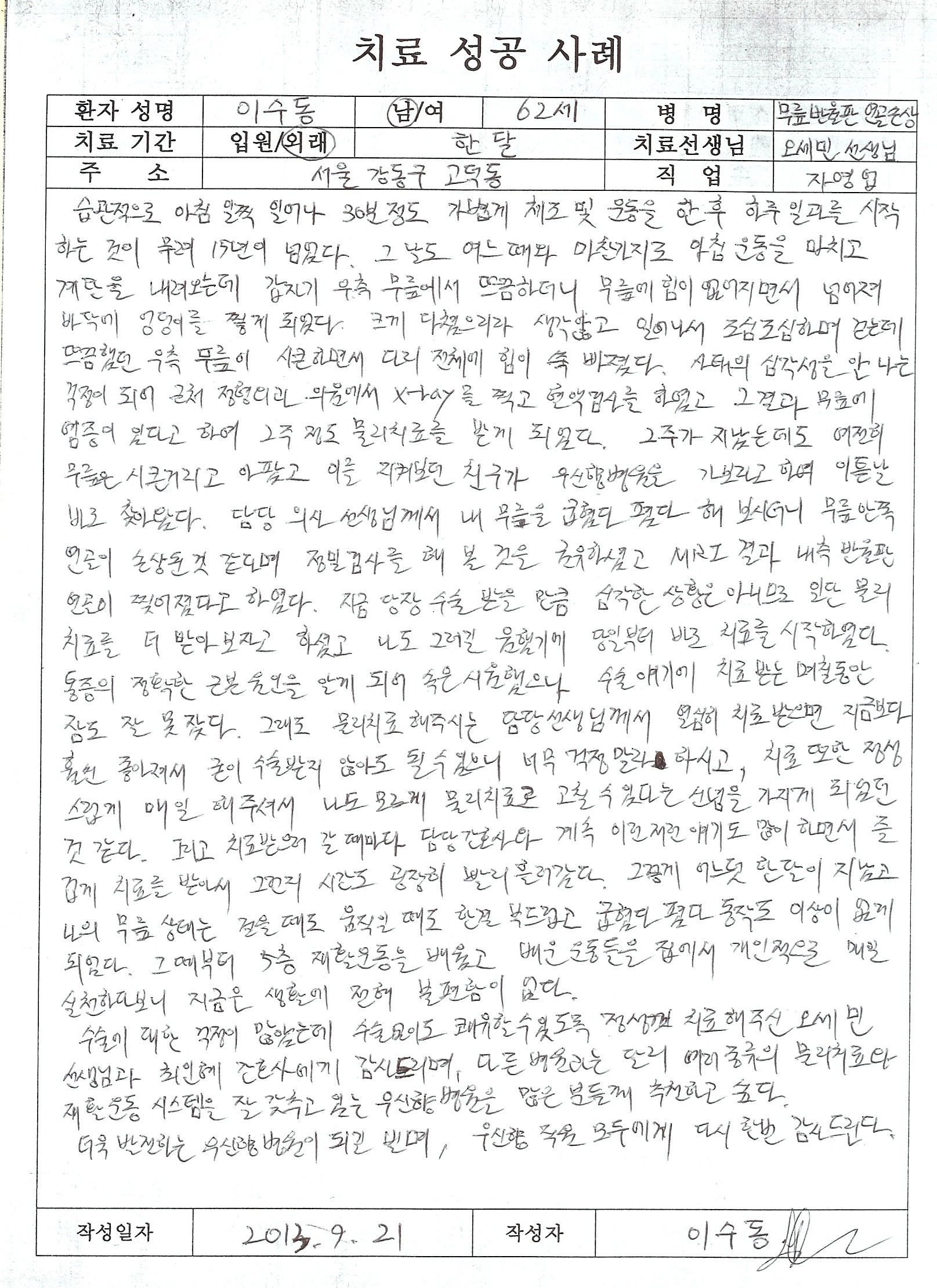 그리고 치료 받으러 갈 때마다 담당 간호사와 계속 이런저런 얘기도 많이 하면서 즐겁게 치료를 받아서 그런지 시간도 굉장히 빨리 흘러갔다. 그렇게 어느덧 한 달이 지났고 나의 무릎상태는 걸을 때도 움직일 때도 한결 부드럽고 굽혔다 폈다 동작도 이상이 없게 되었다. 그때부터 5층 재활 운동을 배웠고 배운 운동들은 집에서 개인적으로 매일 실천하다 보니 지금은 생활에 전혀 불편함이 없다.