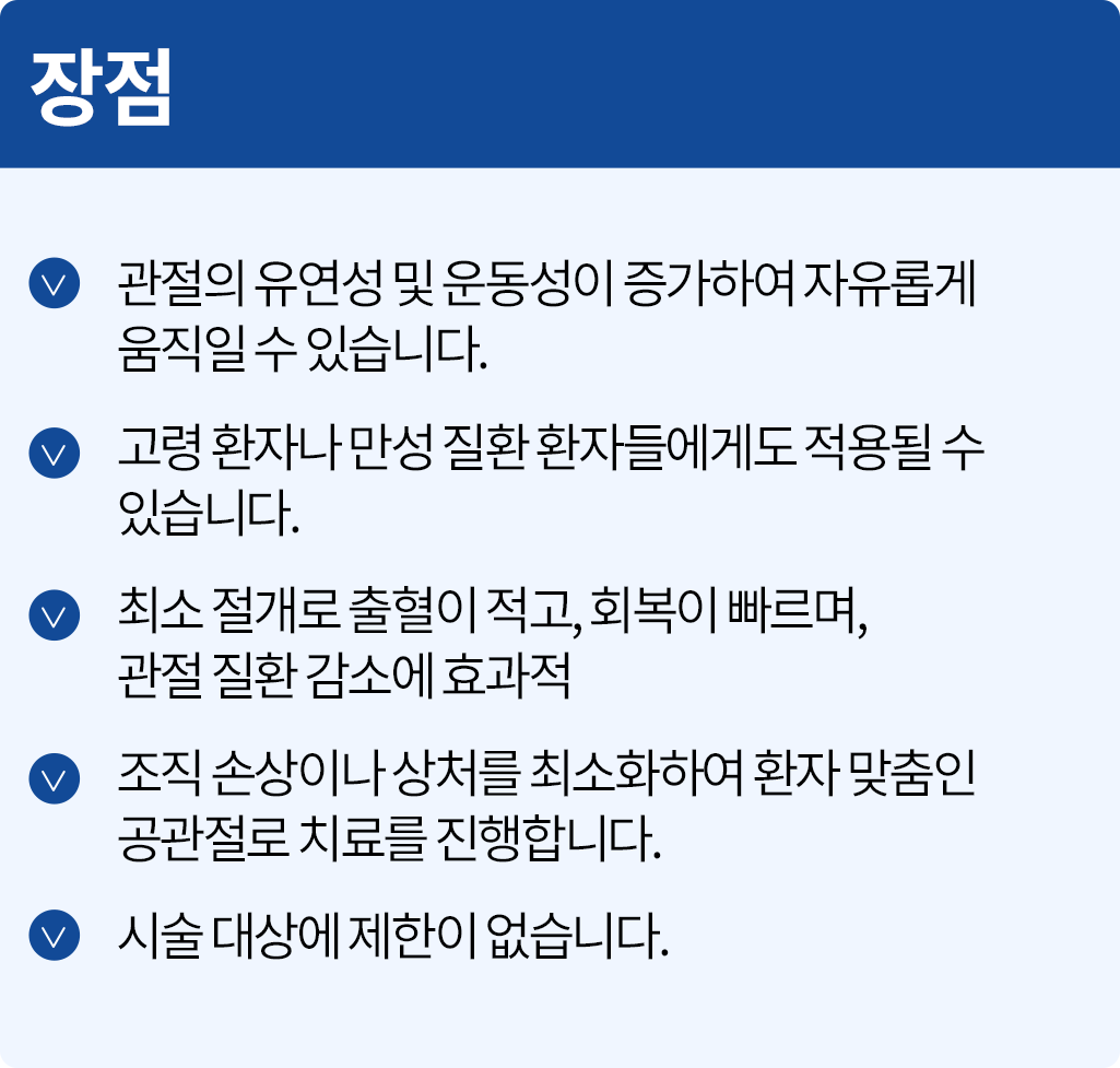 모니터를 이용하여 정확한 관절 질환의 검사하며, 파열된 힘줄 및 연골판을 봉합하거나,