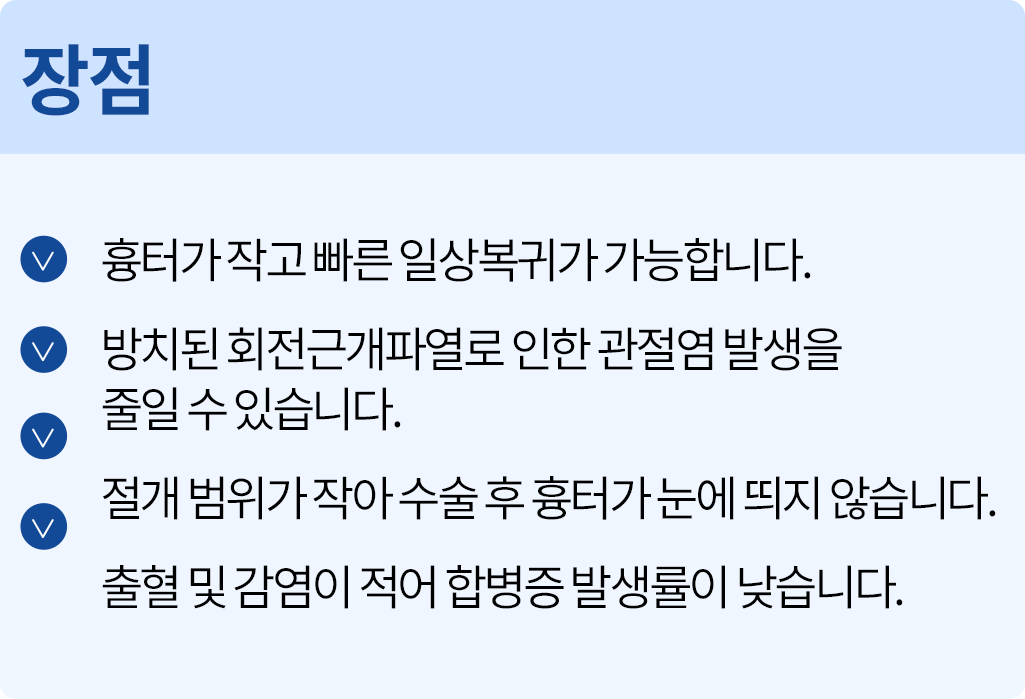 어깨뼈와 회전근개 힘줄이 충돌로 인하여 나타나는 염증 등을 관절경을 이용하여